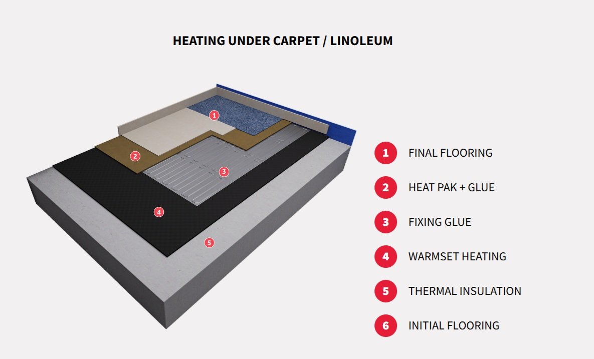 The system is installed over insulation and directly beneath the finished floor covering, providing efficient radiant heat transfer across the entire floor surface.